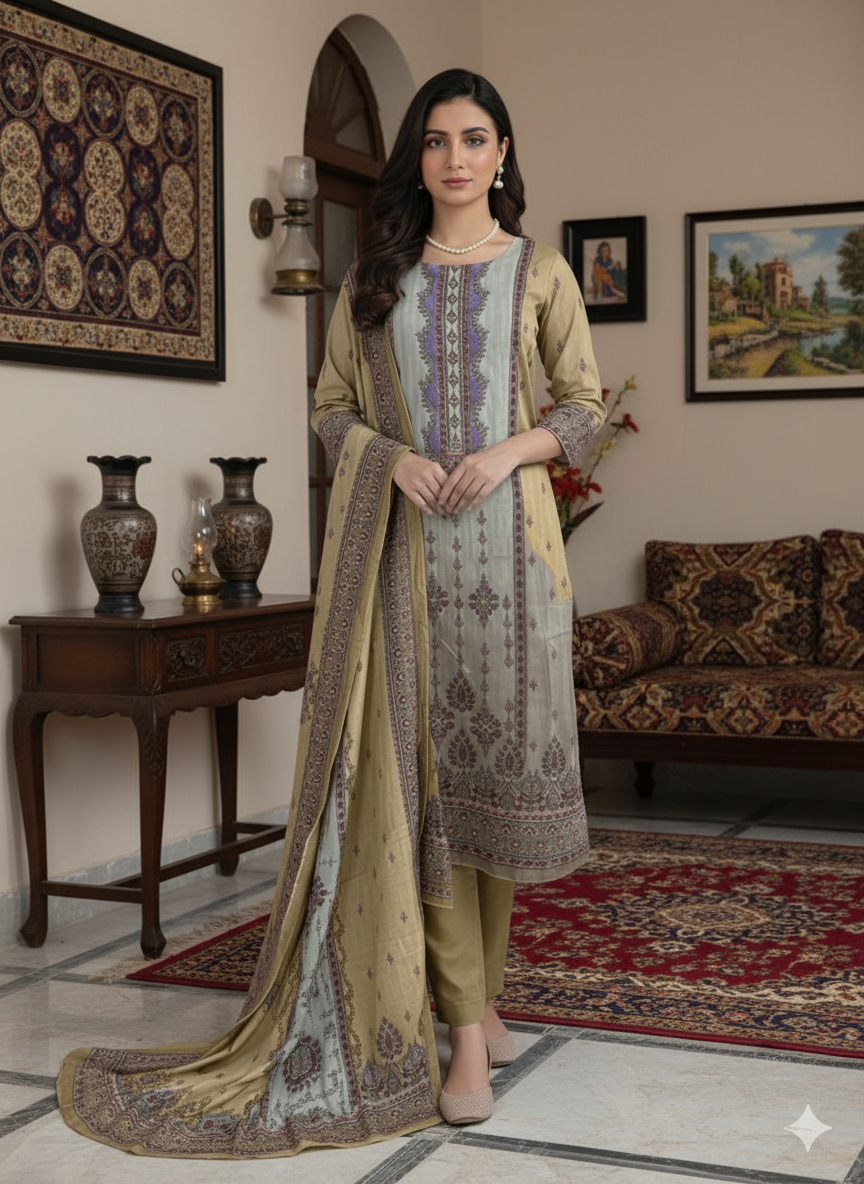 A sophisticated unstitched dress material set that artfully blends luxe and comfort fabrics for refined traditional style. The top is crafted from pure satin in a graceful beige hue, accented by intricate Kashmiri-inspired digital prints and exquisite ethnic handwork with mauve/maroon and rose motifs, adding depth and elegance. Paired with a pure cotton bottom in a coordinating beige shade for comfort and practicality. The pure viscose muslin dupatta, in soft beige with mauve and maroon digital prints and a detailed border, drapes lightly for a complete and elegant ensemble—ideal for festive occasions and special gatherings.