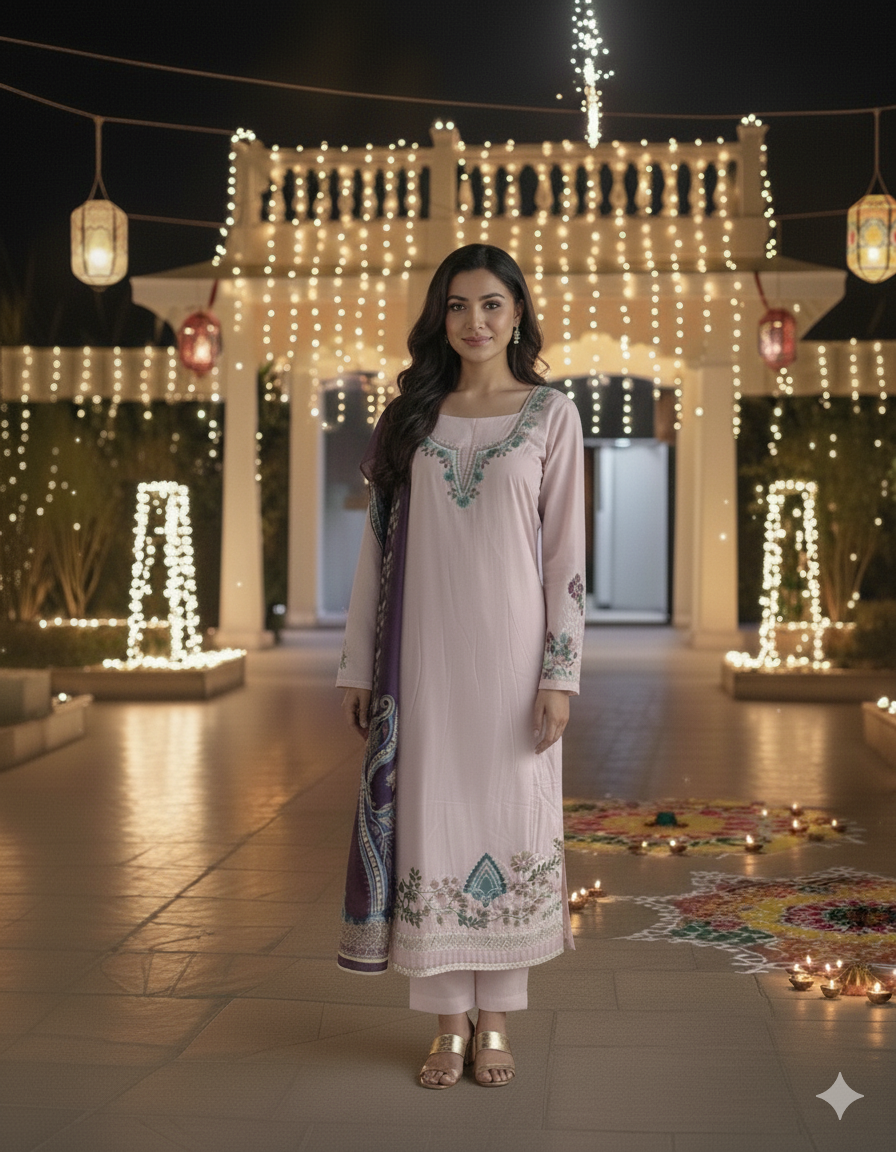 Elegant dusty pink Pakistani dress material set in premium German rayon fabric. The top features multicolor embroidery on the neckline, front panel, and hemline, paired with a plain German rayon bottom and a rich maroon printed dupatta with traditional paisley and floral motifs. Soft, lightweight, and breathable—perfect for festive wear, casual gatherings, or office attire.