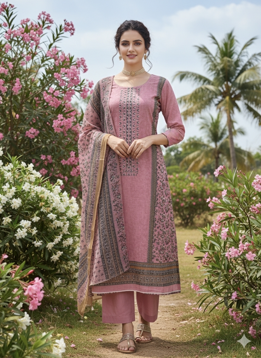 Elegant unstitched dress material set crafted for comfort and timeless style. The top is made of pure cotton in a soft dusty rose shade, featuring exquisite embroidery concentrated near the neckline and running down the front panel, adding a touch of handcrafted sophistication. The matching bottom, also in pure cotton, offers breathable comfort and a coordinated look. The ensemble is completed with a lightweight chiffon dupatta, beautifully printed with graceful floral and ornamental motifs and bordered edges, providing a light, flowing finish that harmonizes with the embroidered top. Perfect for festive occasions, gatherings, or refined everyday wear.