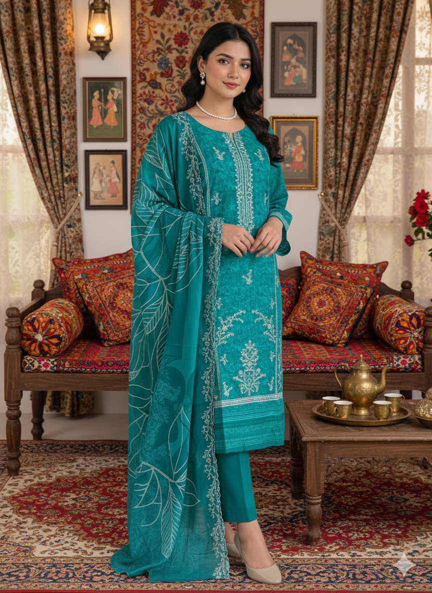 Elegant unstitched dress material set crafted from pure cotton fabric, perfect for festive occasions and everyday ethnic wear. The top features intricate embroidery work in a vibrant teal blue shade, lending it a refined and graceful appearance. The matching pure cotton bottom provides comfort and a cohesive look, while the dupatta is adorned with bold leaf motifs and delicate border embroidery, adding a touch of contemporary flair.