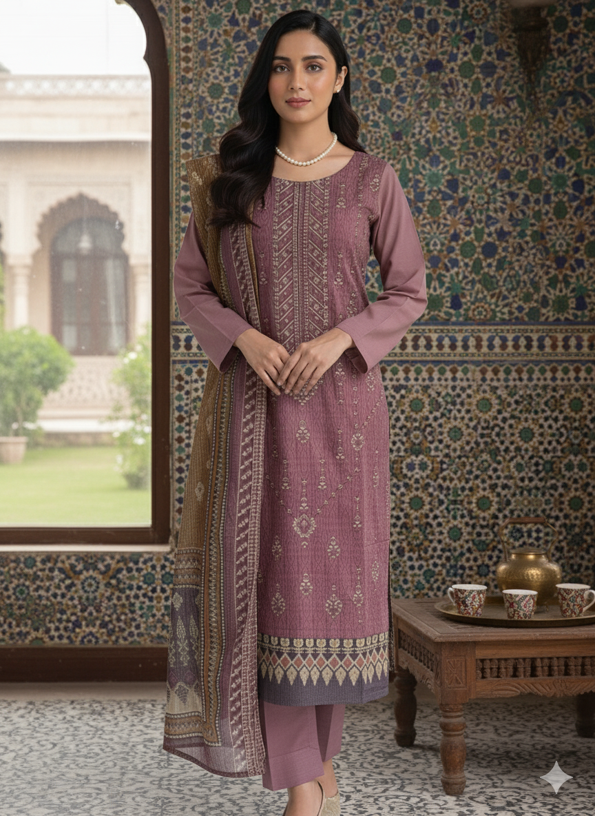 Refined unstitched dress material set crafted entirely from pure cotton for superior comfort and breathability. The top features a delicate ivory base with intricate black printed floral and paisley patterns, elevated with elegant embroidery on the neckline and borders for a touch of sophistication. The pure cotton bottom in matching ivory completes the look with a clean and versatile finish. The pure cotton dupatta showcases complementary prints that echo the motifs of the top, creating a harmonious and elegant ensemble.