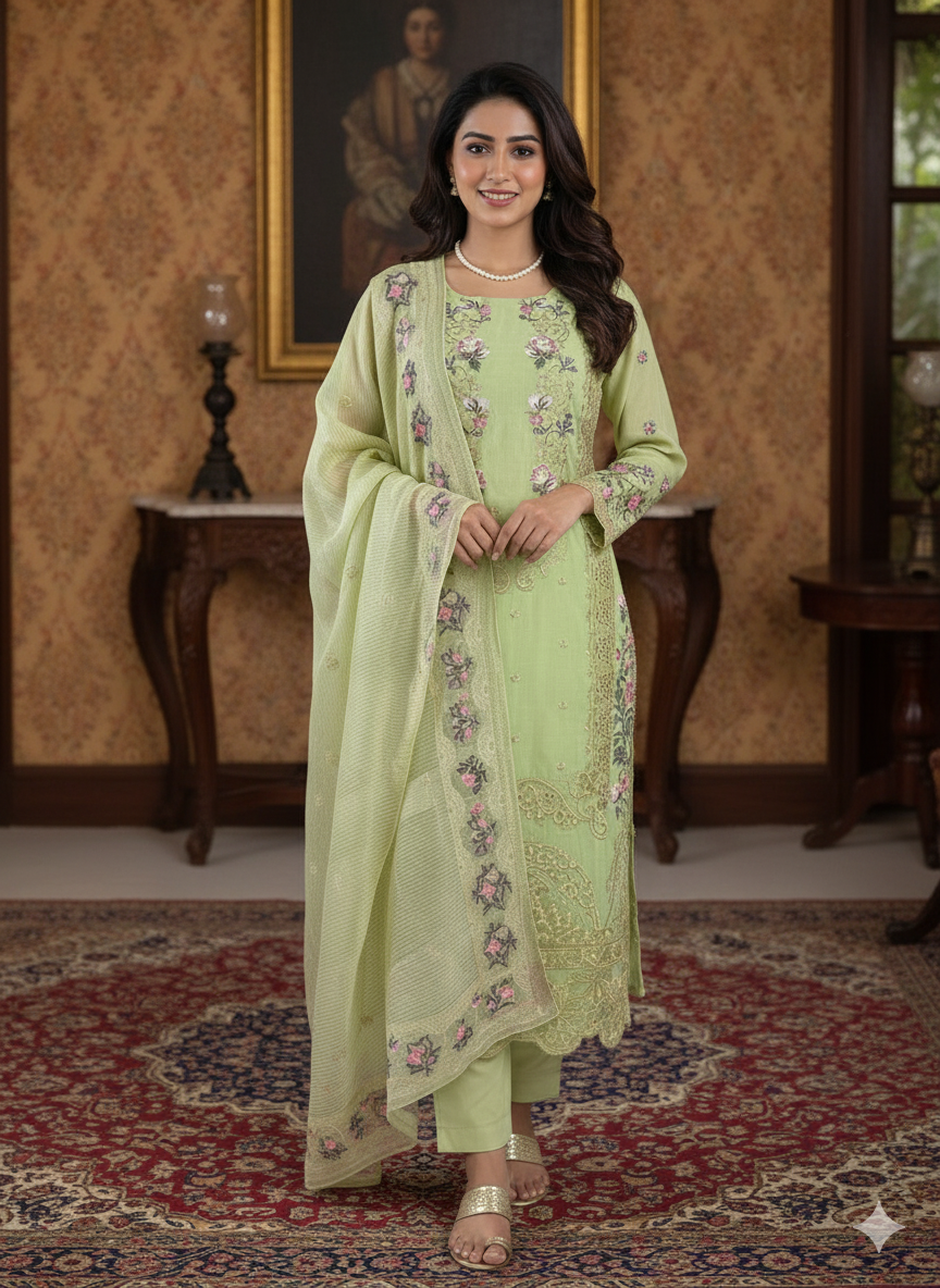 Refresh your wardrobe with this stunning three-piece dress material set, thoughtfully designed for comfort and distinctive style. The top is crafted from pure cotton in a vibrant lime green shade, highlighted by heavy self embroidery in intricate floral and ornate patterns. Delicate threadwork in cream, pink, purple, and green adds luxurious detail and texture, making this piece perfect for festive occasions or elegant daytime looks. The semi lawn bottom, in a matching lime green tone, is lightweight and soft, ensuring all-day comfort and ease of movement. The ensemble is completed with an embroidered Kota Doriya dupatta, featuring decorative floral motifs along the border and dainty lace-like edges for an airy, sophisticated finish.