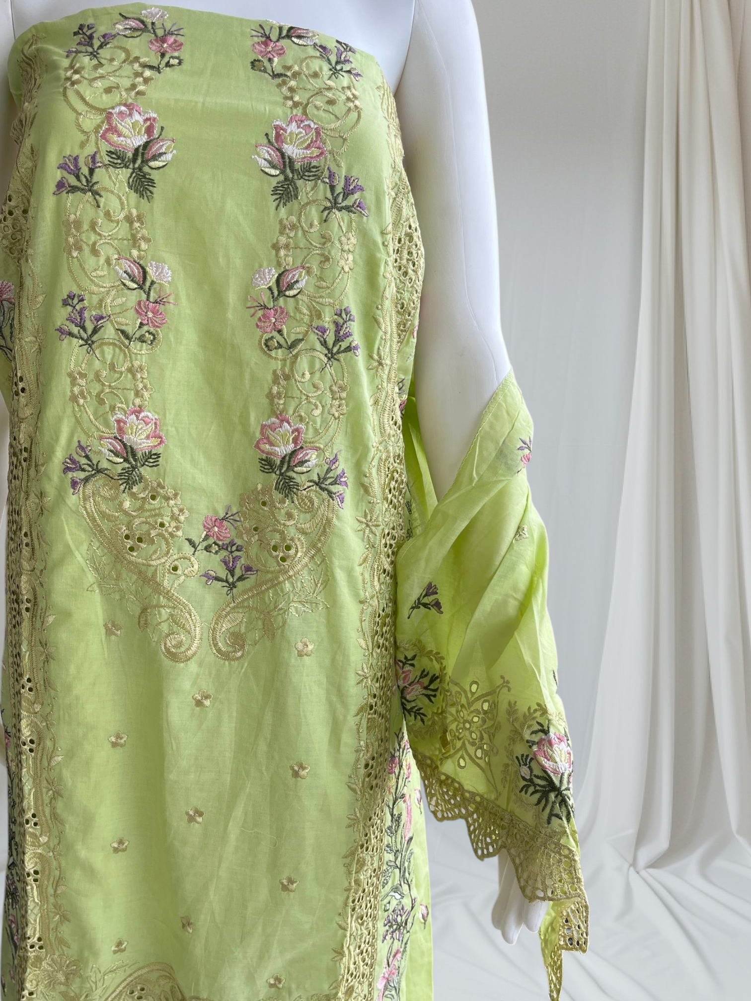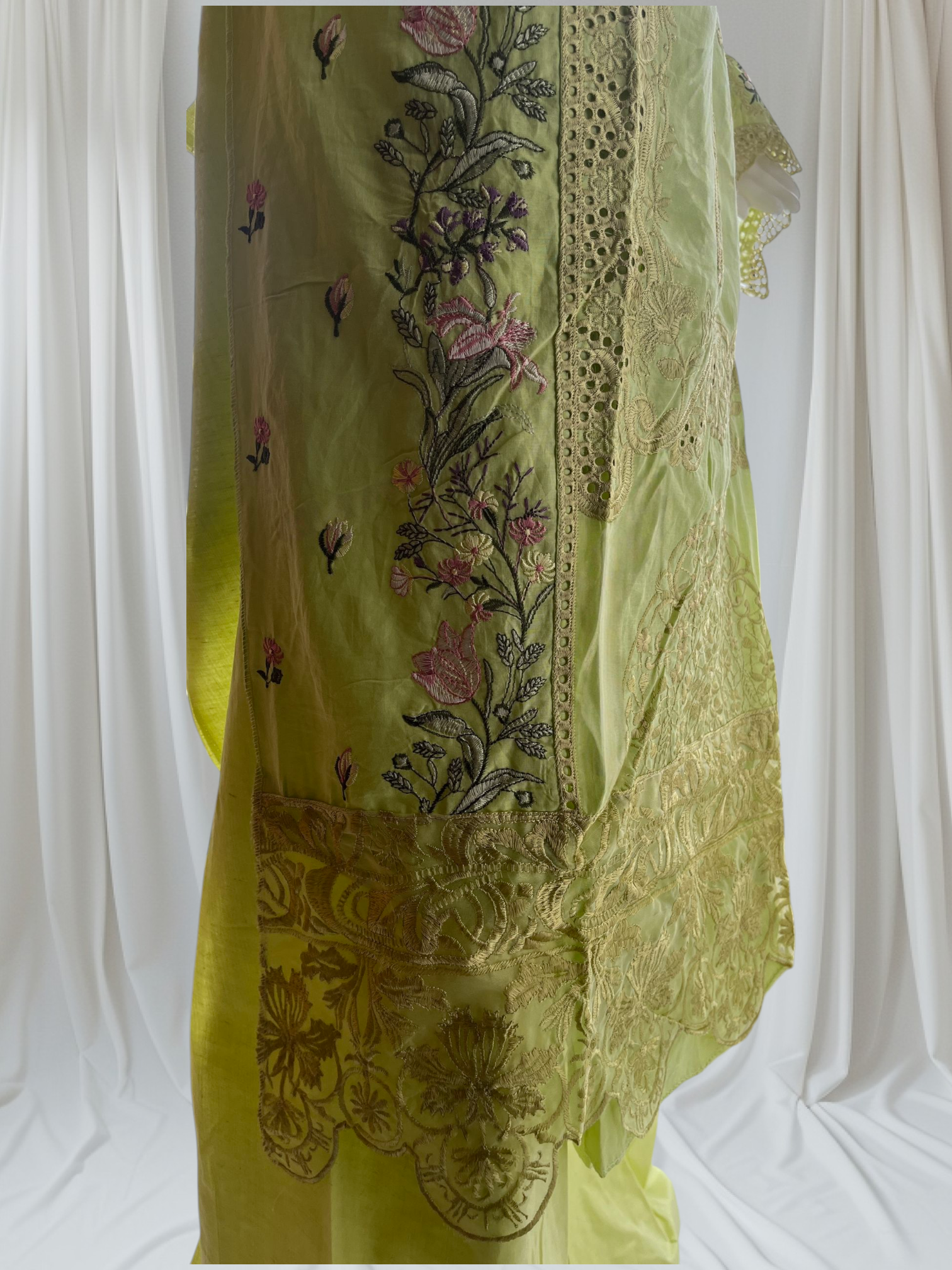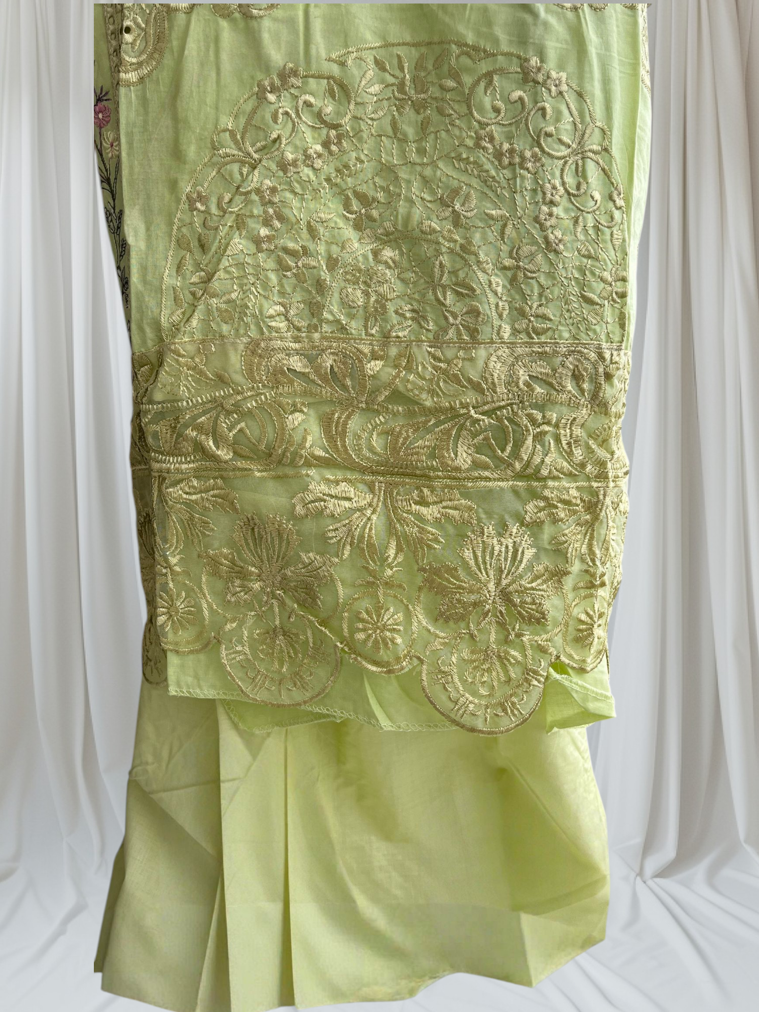 Top: Pure cotton with heavy self embroidery in cream, pink, purple, and green floral and ornamental designs.