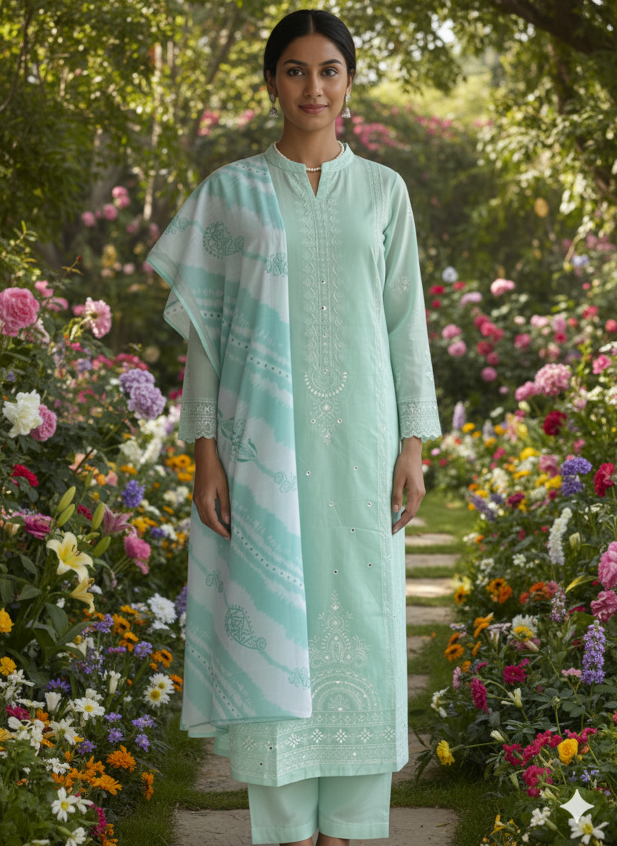 Elegant unstitched dress material set crafted entirely from pure cotton for maximum comfort, breathability, and style. The top showcases a refreshing mint green base adorned with intricate white thread embroidery featuring ornamental and paisley-inspired motifs, enhanced by delicate mirror work for subtle sparkle. The matching pure cotton bottom in a solid mint green provides a smooth drape and all-day comfort, while the pure cotton dupatta features tie-dye inspired stripes with printed floral and paisley motifs, bordered for a graceful, coordinated finish. This ensemble is ideal for festive functions, summer gatherings, and everyday elegance.