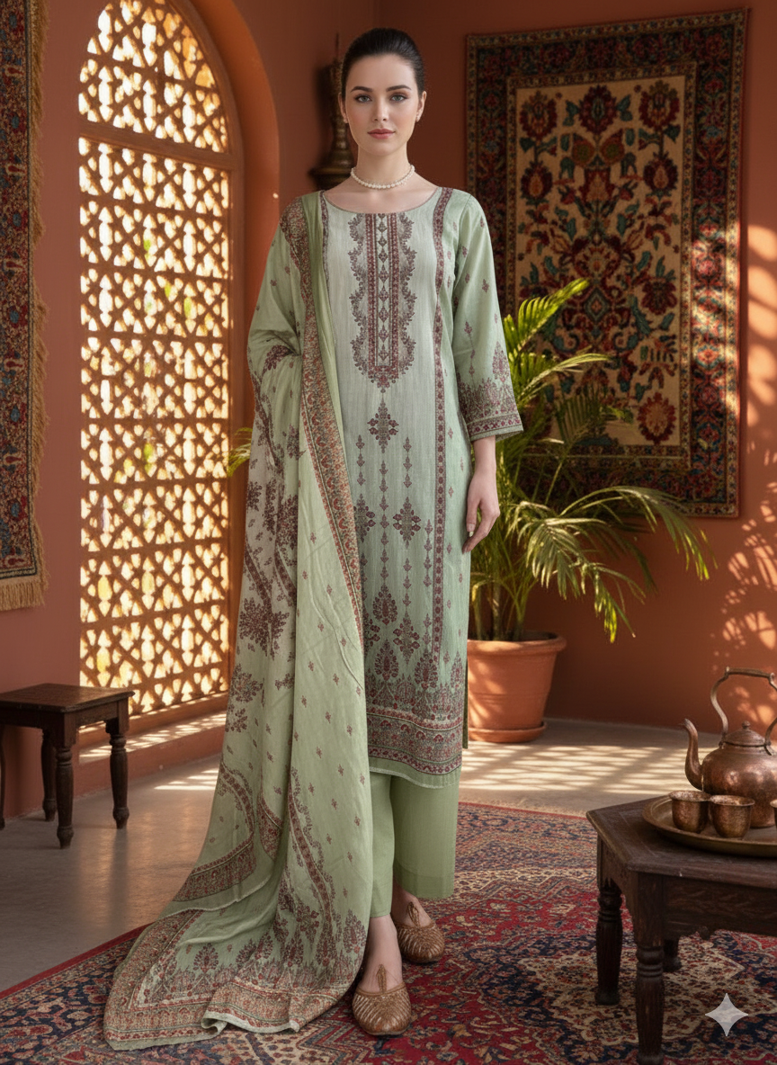 Elegant unstitched dress material set combining a luxurious blend of fabrics for a refined traditional look. The top features pure satin in a soothing olive green shade, adorned with intricate digital Kashmiri-inspired prints and highlighted with fine ethnic handwork for a touch of artistry. The bottom is crafted from pure cotton in a matching olive tone, offering comfort and effortless styling. Completing the ensemble is a pure viscose muslin dupatta, digitally printed with complementary patterns and classic borders, adding lightness and graceful movement to the outfit.