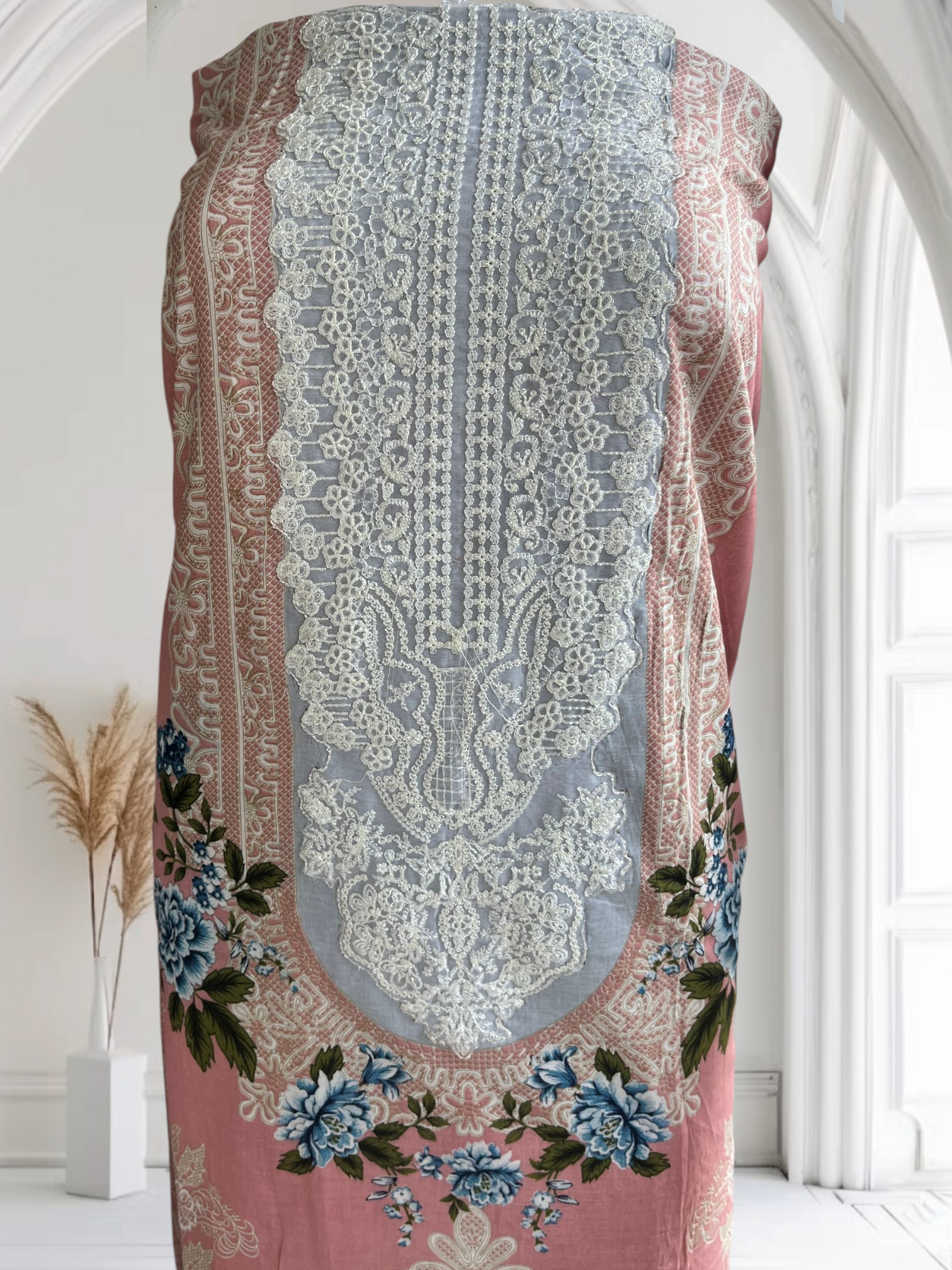 Dupatta: Pure cotton, lightweight and soft; featuring a blend of rose pink, powder blue, and yellow with printed floral designs and ornate borders