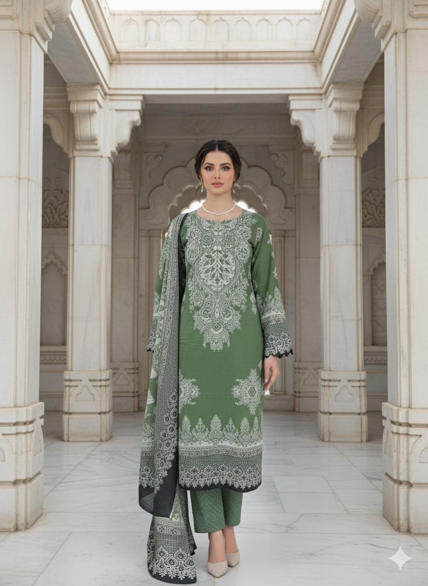 Elegant unstitched dress material set crafted entirely from pure cotton, perfect for comfort, breathability, and easy everyday elegance. The top features a soothing sage green base highlighted by fine white printed motifs in traditional floral and ornamental patterns, adding grace and a timeless ethnic touch. The matching pure cotton bottom in coordinated sage green with subtle linear prints ensures a comfortable drape and finishing touch. Completing the ensemble, the pure cotton dupatta is adorned with coordinating botanical and ornamental prints along with a classic border, giving the outfit a harmonious and refined look. Ideal for festive gatherings, casual outings, or day-to-day sophistication.