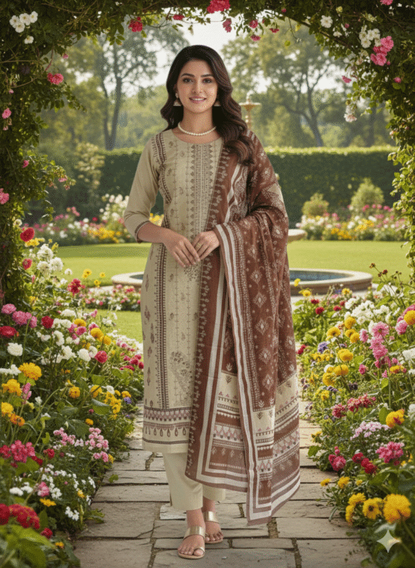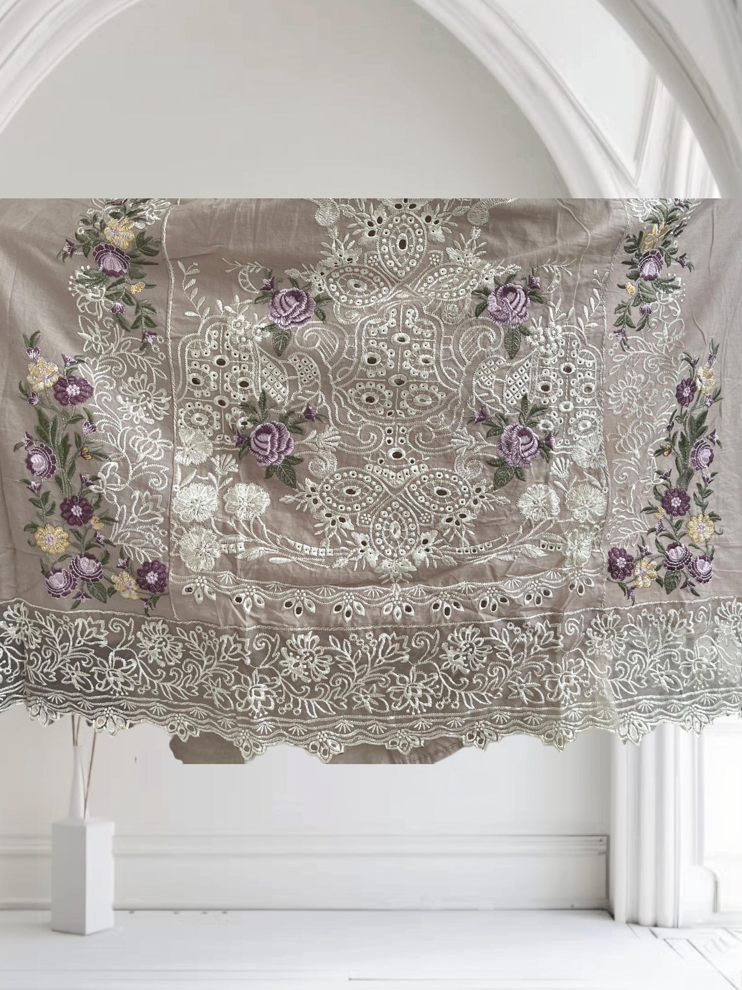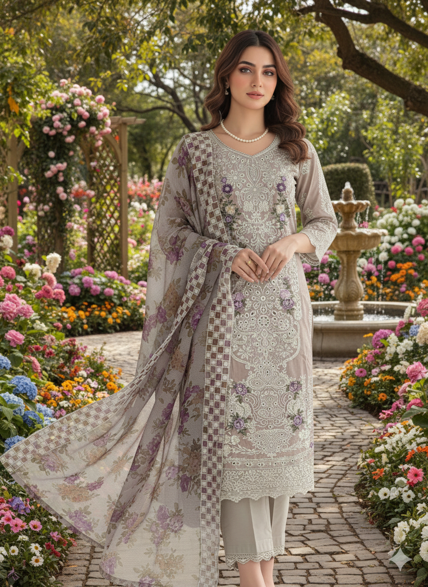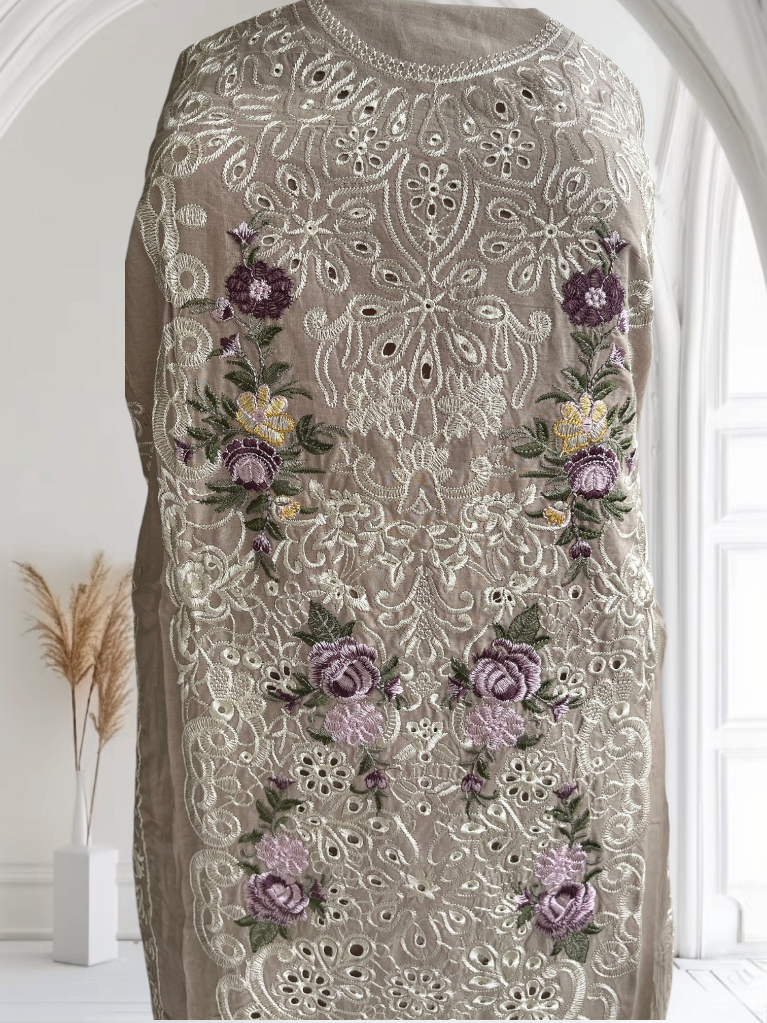 Discover understated luxury with this exquisite three-piece dress material set, masterfully designed to combine elegance with comfort. The top is crafted from pure cotton in a sophisticated taupe shade, adorned with heavy self embroidery featuring intricate cutwork and ornamental patterns. The detailed threadwork includes beautiful floral motifs in purple, white, and green, creating stunning dimensional effects and refined detailing perfect for special occasions. The semi lawn bottom, in matching taupe, provides lightweight comfort and graceful draping. The ensemble is completed with an embroidered Kota Doriya dupatta, showcasing elaborate white lace appliqué work combined with vibrant floral embroidery in purple, green, and yellow accents across the translucent fabric, finished with geometric borders and delicate lace edges for an ethereal, sophisticated look.